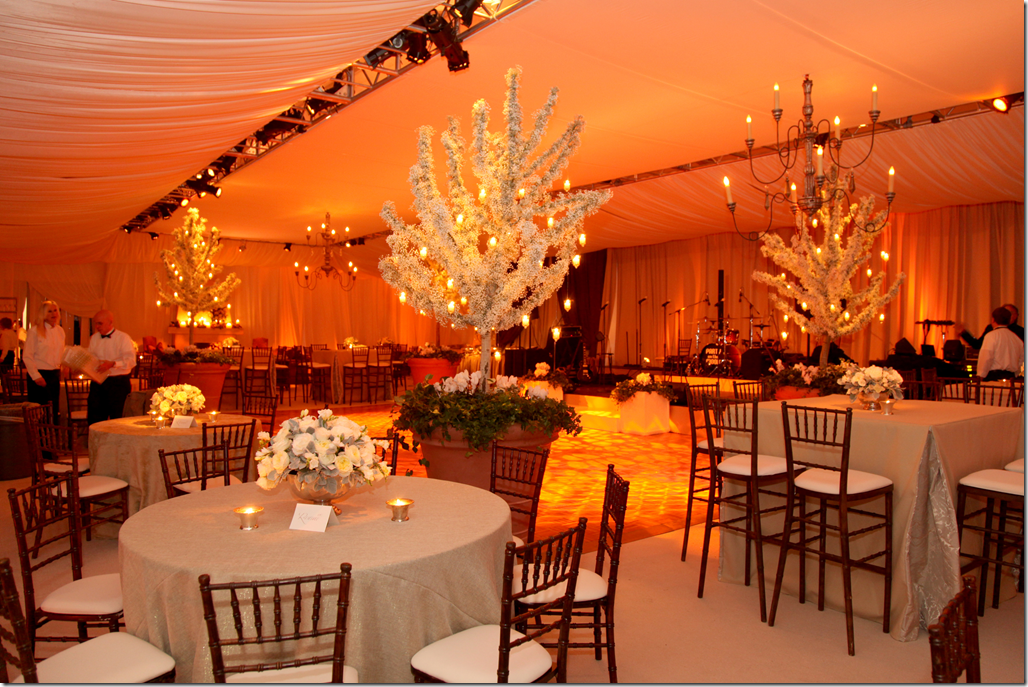 Inside the tent. All the tables were skirted in linen. The sides of the tent were draped. Jill Brown from Houston’s BROWN provided the large Italian chandeliers for the event. The Dillons wanted the tent to seem as if it was another room in the house.